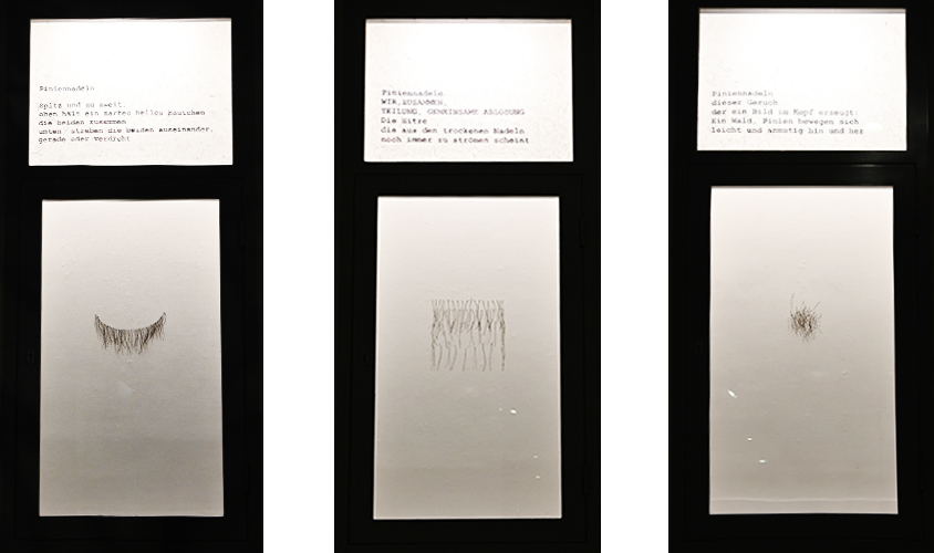 Zu einem Gedicht sind poetisch zarte Arbeiten aus Piniennadeln entstanden, die Pininiennadelgebilde schweben im Vitrinenraum.