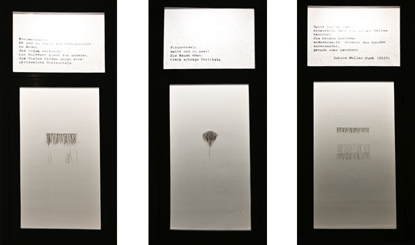 Zu einem Gedicht sind poetisch zarte Arbeiten aus Piniennadeln entstanden, die Pininiennadelgebilde schweben im Vitrinenraum.